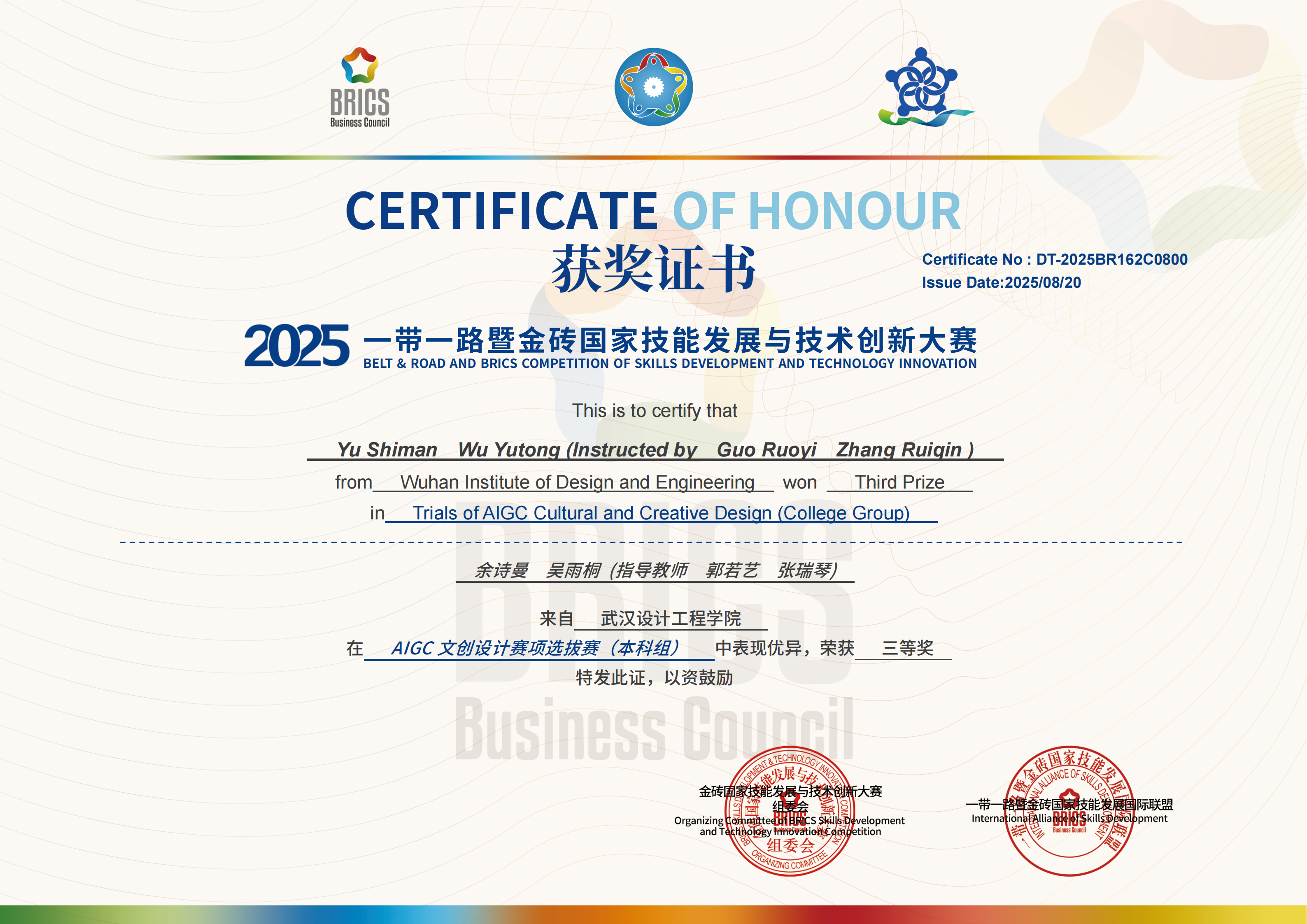本网讯(通讯员 张瑞琴)近日,2025年一带一路暨金砖国家技能发展与技术创新大赛之AIGC文创设计赛事圆满落幕。在我院郭若艺、张瑞琴两位老师的指导下,来自国际经济与贸易专业的张陈龙、余诗曼、吴雨桐和旅游管理与服务教育专业的尚晓莉四位同学组建的两支参赛队伍表现亮眼,荣获中部赛区三等奖两项。