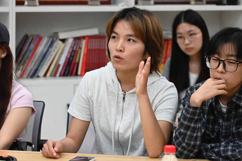 来自文化产业管理专业的陈阳泽同学及来自旅游管理与服务教育专业的阮鑫蕾同学均就AI的开发与利用与Julien先生展开互动交流,Julien先生表示应主动培养创造性思维,在对待AI时,应视其为“思维的扩展器”,学会与之协作,用算法拓展表达边界,但始终保持人的判断力与情感温度。